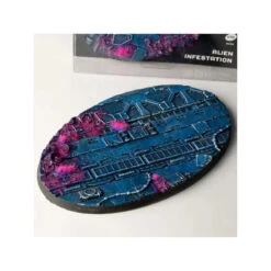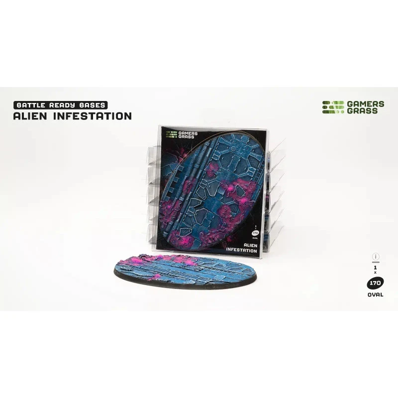 This blister contains 1 thermoplastic 170mm wide oval Battle Ready Base, in an Alien Infestation theme.