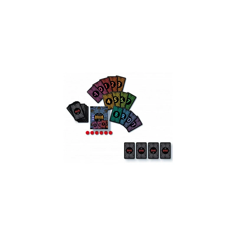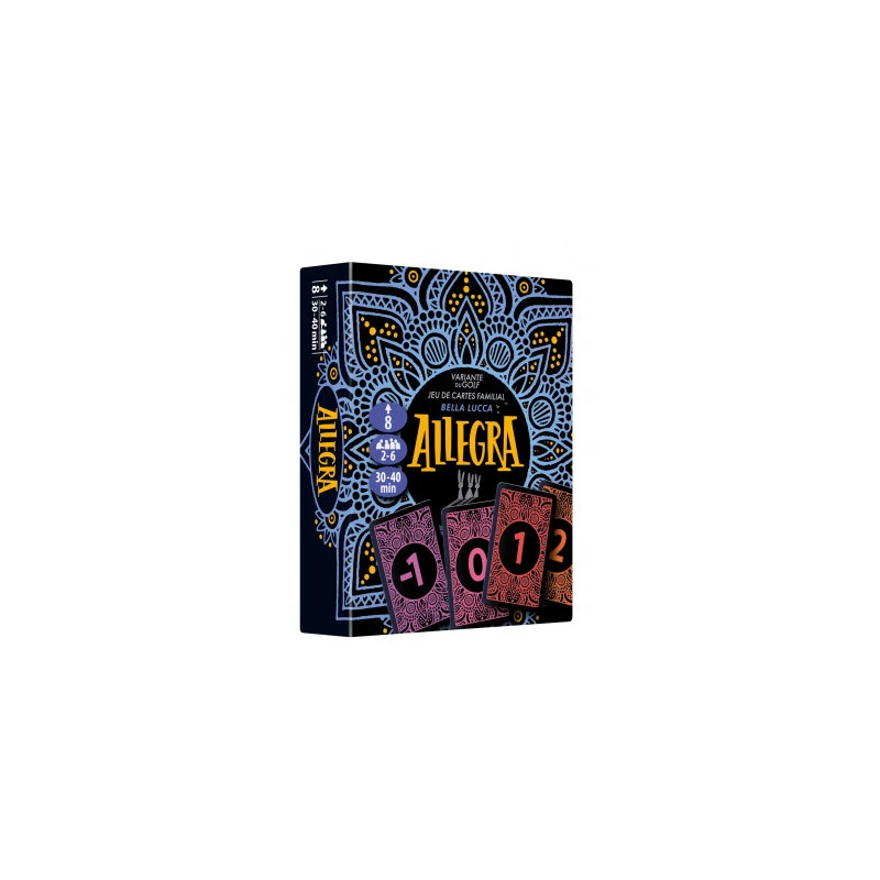 Allegra est une variante semi-coopérative de la vaste gamme de jeux de cartes qui se pratiquent depuis longtemps sous le nom de Golf. Les cartes de poker étaient utilisées pour y jouer jusqu’à il n’y a pas longtemps. L’élément communicatif du knocking et le fait que chaque joueur ne reçoive que 12 cartes, mais joue avec 15 cartes, font d’Allegra une expérience très particulière.
