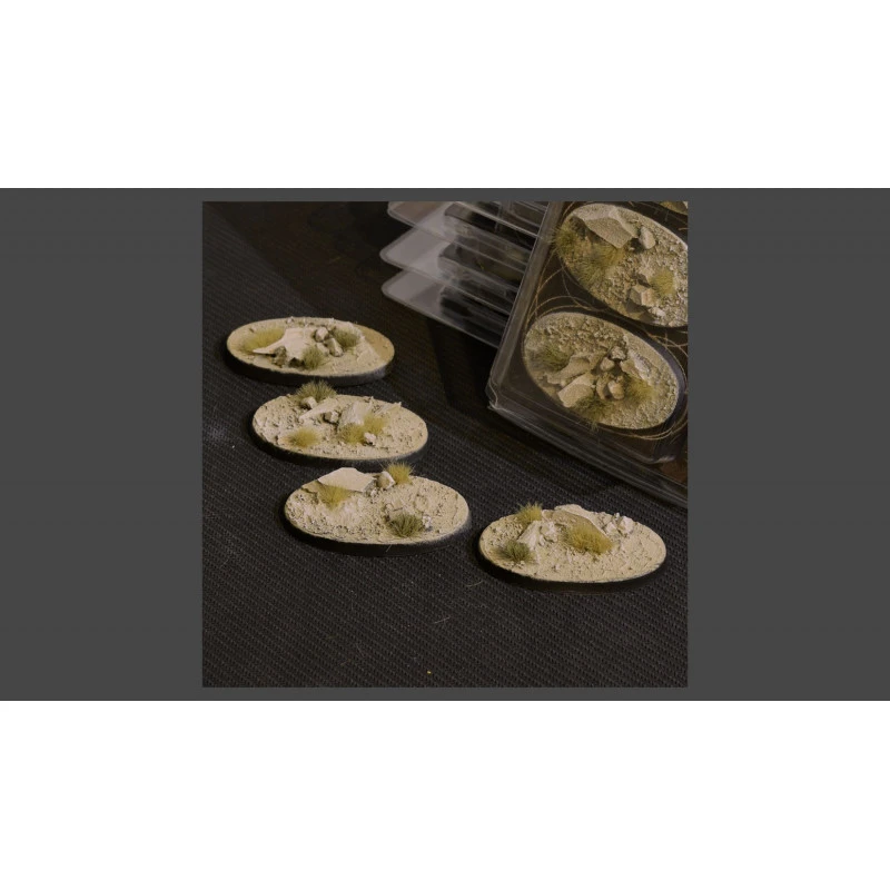 This pack contains 4 oval Battle Ready Bases 60mm wide in an arid steppe theme.