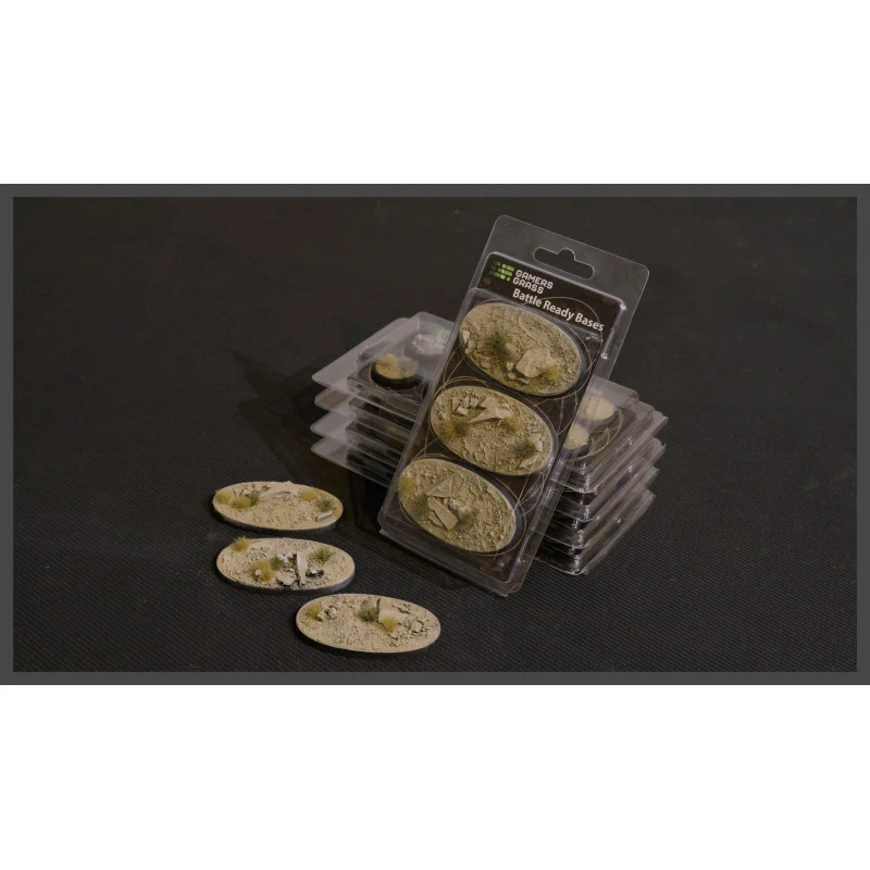 This pack contains 3 oval Battle Ready Bases 75mm wide in an arid steppe theme.