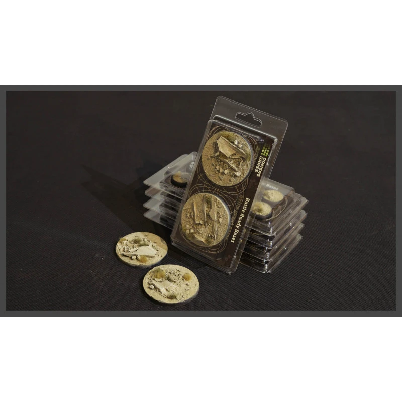 This pack contains 2 round Battle Ready Bases 60mm wide in an arid steppe theme.
