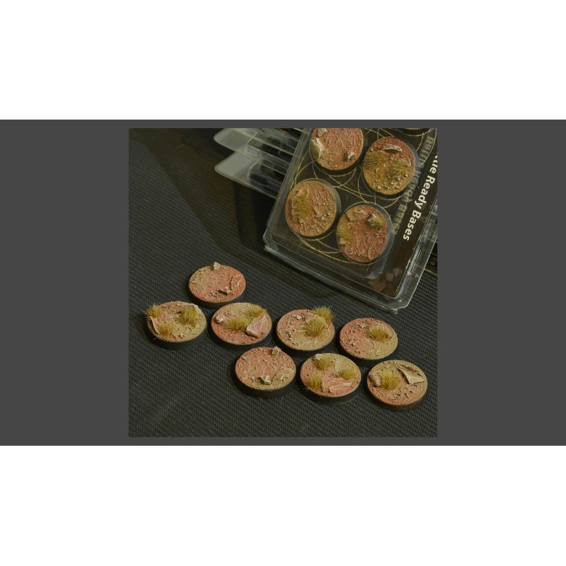 This pack contains 8 round Battle Ready Bases 32mm wide in a badlands theme.