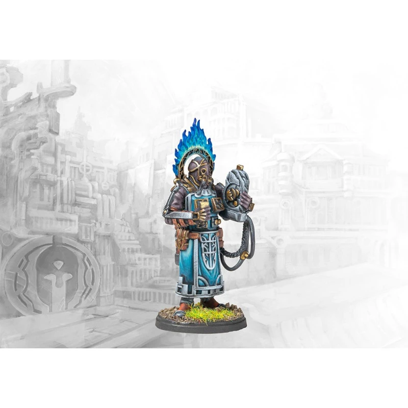 Every army of the City States that marches to war, does so under the supervision of at least one Mechanist. One could be forgiven for believing he is there to ensure the smooth operation of the army and the countless machines, both big and small, that are so vital to the smooth operation of a City State’s army. What many fail to recognize is that he is there to ensure that reality itself operates along the rules and parameters laid out in their Lexicons by their Divinity. How they Play: As a spellcasting support Character, the Mechanist excels when positioned just behind the main battle line providing necessary utility abilities and enhancing the range of your Promethean’s spells. Activate the Mechanist’s Supremacy Ability to give all Regiment’s Activating from your Strategic Stack the Hardened (+1) Special Rule and see your enemies halt their advance before the might of your shieldwall!