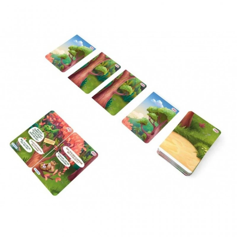 Parlez aux animaux de la jungle et découvrez ce qu’ils savent ! Attention aux fausses pistes, vous devez décider quelles cartes peuvent vous aider à résoudre l’affaire de ce mystérieux œuf… Les joueurs choisissent les cartes et les assemblent pour dresser un tableau complet de ce qui est arrivé.
