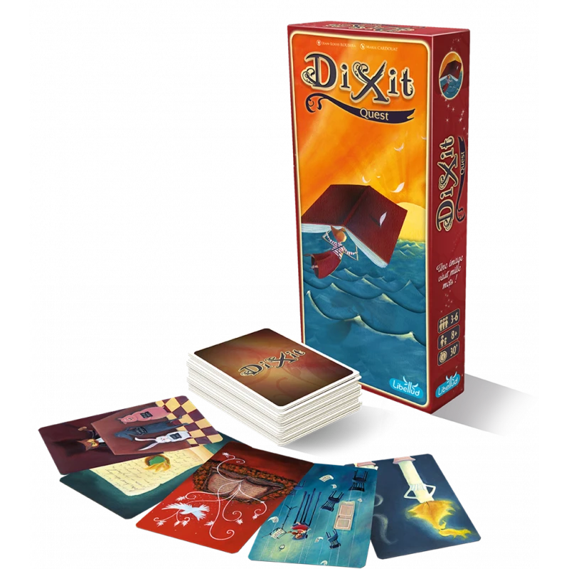 Avec Dixit Quest, embarquez pour un nouveau voyage surprenant qui vous emmènera bien au-delà de votre imagination. Vous serez transporté dans un monde fantastique à travers 84 nouvelles illustrations pleines de paysages exotiques et de créatures extraordinaires !