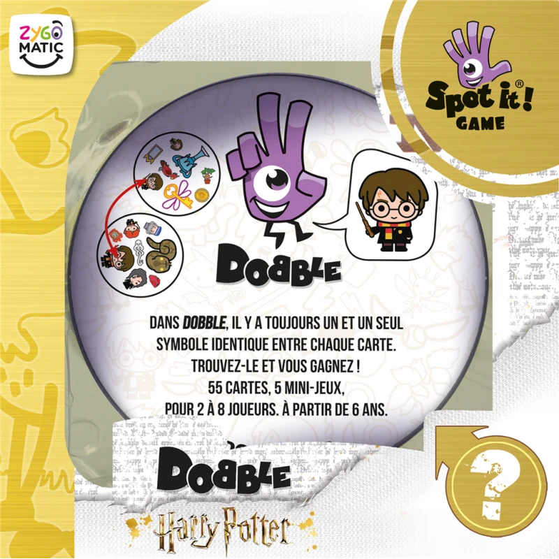 Tous les fans de Dobble et d’Harry Potter en ont rêvé, le voici, le Dobble Harry Potter ! Deux légendes se retrouvent dans cette petite boîte : Dobble, ses 55 cartes, ses 5 règles et son principe qui fédère toute la famille et les amis autour d’un moment convivial, et Harry Potter, la saga célèbre dans le monde entier !