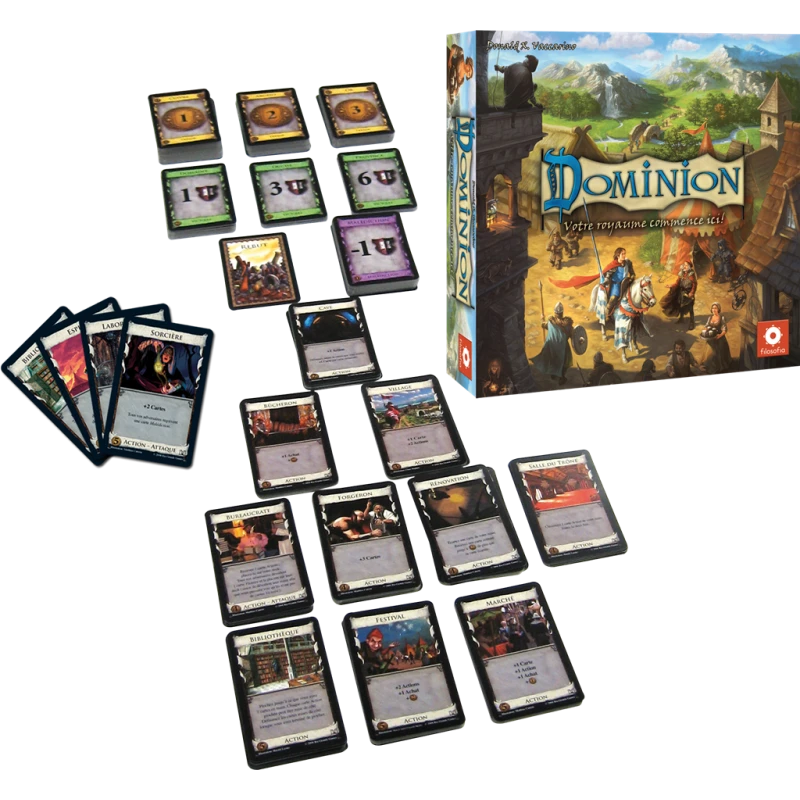 Étendez votre domaine ! Vous êtes le souverain d’un paisible royaume verdoyant. Vous rêvez d’étendre ce royaume et de le rendre plus grand et plus riche. Il vous faut un véritable Dominion ! En unifiant sous votre bannière les nombreux fiefs au bord de l’anarchie qui vous entourent, vous leur apporterez paix et civilisation. Mais d’autres monarques partagent vos ambitions. Vous devrez agir promptement afin d’acquérir le plus de terres possible !