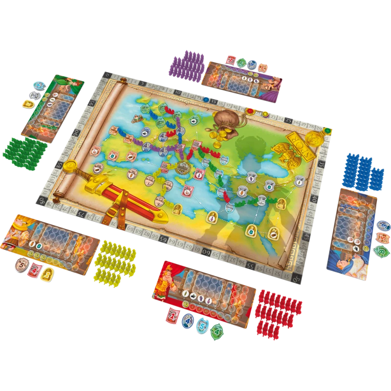 Pour cela, rien de plus simple : reliez entre elles des villes, grâce aux routes dont les Romains étaient friands. Toute ville que vous reliez ainsi à Rome vous rapporte des points, à travers des jetons Villes et Richesses. Une fois que l’Empire Romain a bâti des routes jusqu’à tous les centres urbains du continent, la partie s’achève et le soldat avec le plus de points l’emporte !