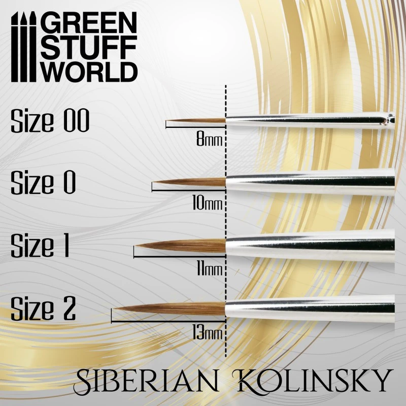 Gamme de pinceaux kolinsky Green Stuff World, GOLD SERIES. Faits à la main avec un manche en bois de haute qualité et une virole en laiton, et seules les meilleures parties des poils Kolinsky Siberian ont été utilisées dans la fabrication des pinceaux Gold Series, produisant des pinceaux haut de gamme de la plus haute qualité. Ils se distinguent de la gamme de qualité moyenne Silver par leur plus grande capacité à charger la peinture, une plus grande autonomie et une capacité de ligne très fine.