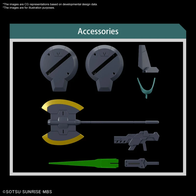 Accessories: Large ax × 1, Beam torch × 1, Beam rifle × 1, Parts for character A × 1, Sticker × 1