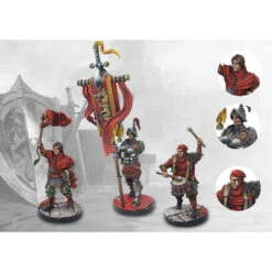 Marching into battle alongside the leadership of the Hundred Kindoms, Tactical Retinues allow their attendant characters (most notably Imperial Officers but also Noble Lords and Chapter Mages) to extend their control and command of the troops at their disposal, ensuring that the men are inspired by the presence of the army standard while his flag signaller and drummer ensure his army operates as a unified whole. This kit contains 3 models that can be used to represent the Tactical retinue 1-3 upgrade in your Hundred Kingdom characters.