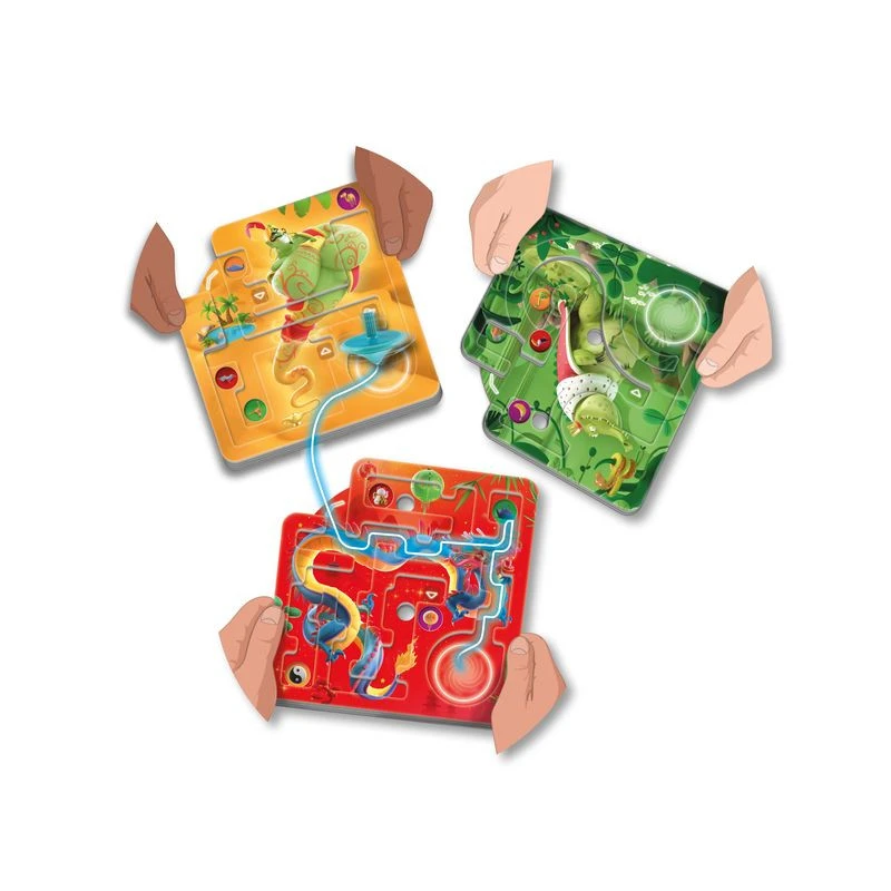LA TOUPIE VOYAGEUSE est un jeu solo ou coopératif pour tout âge dès 6 ans. Chaque mission représente un parcours que les joueurs vont devoir effectuer avec une toupie en la passant d’un plateau à un autre. Ils représentent 8 mondes merveilleux en relief avec plusieurs cibles. Au début de chaque mission, les joueurs identifient ensemble les cibles à atteindre et se répartissent les plateaux indiqués. Le premier joueur lance la toupie avec l’aide du propulseur et la déplace en inclinant son plateau pour la diriger vers sa cible. Une fois la cible atteinte, le joueur guide la toupie vers la sortie pour la faire passer sur le plateau tenu par le joueur suivant. La dynamique de relais entre les joueurs se poursuit ainsi jusqu’à la réalisation complète de la mission. La difficulté des défis s’accroit progressivement. Des trophées autocollants permettent de valider chaque mission réussie !