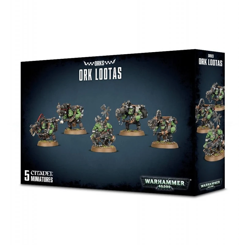 Ce kit plastique contient suffisamment de pièces pour assembler cinq figurines : 4 Lootas ou 4 Burna Boyz, plus un Ork Mek avec méga-blasta kustom. Figurines fournies avec des socles ronds de 32 mm.