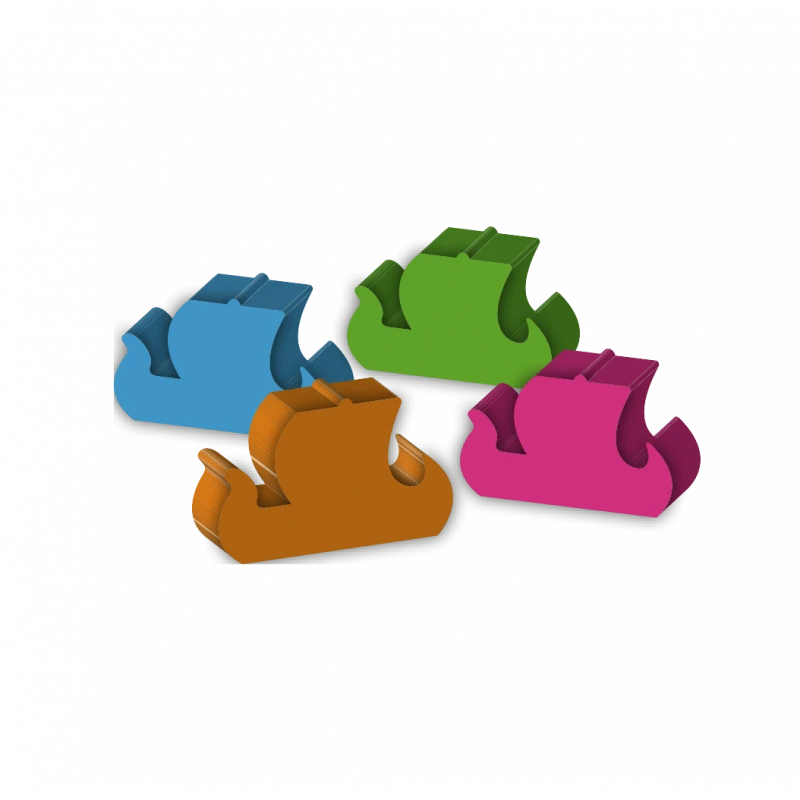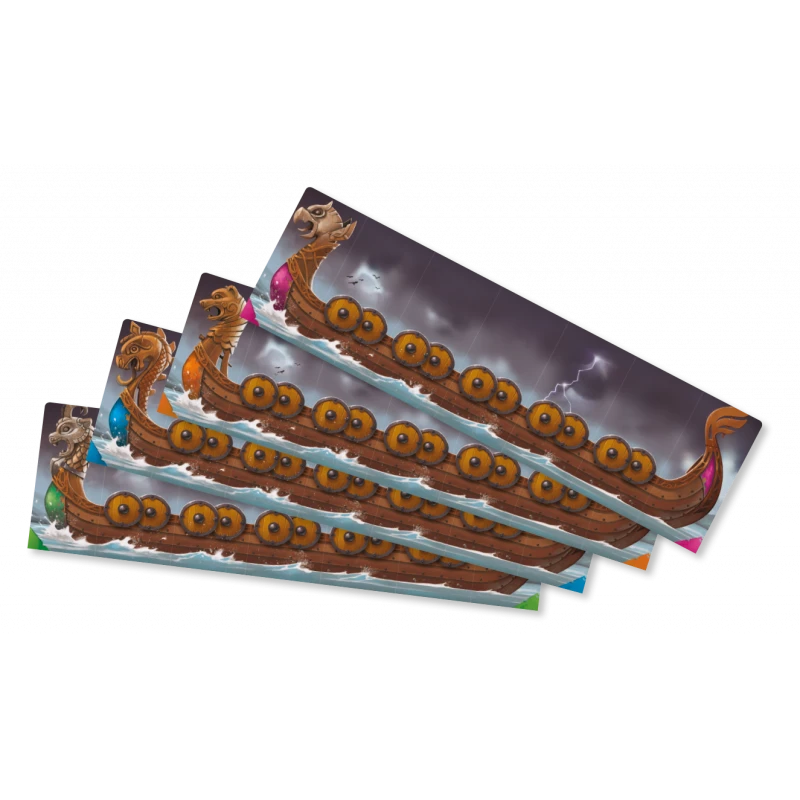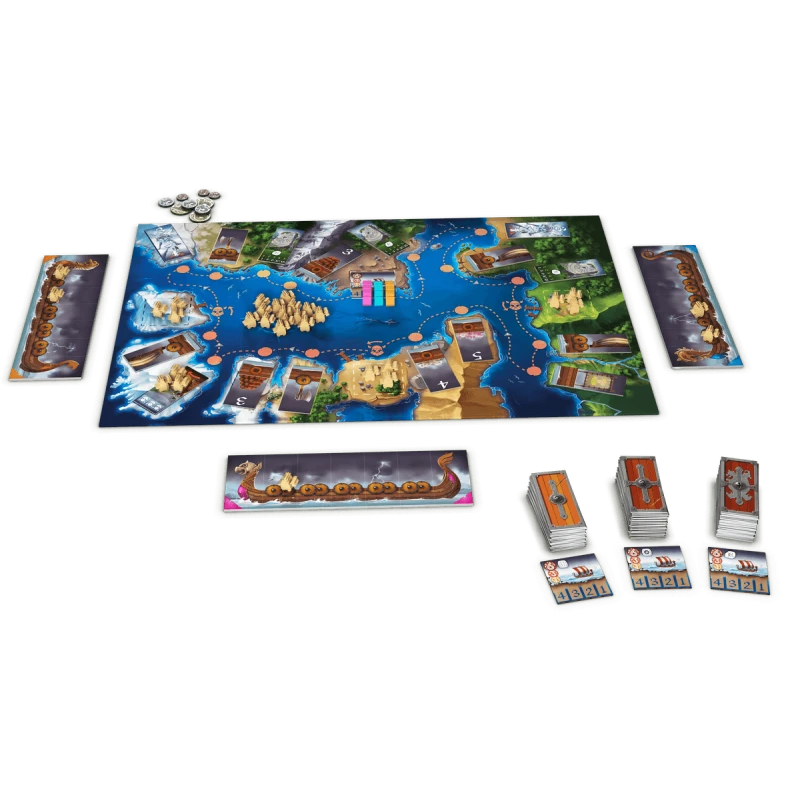Contenu : 1 plateau, 4 plateaux Drakkar, 4 pions Drakkar, 40 pions Viking, 20 pièces en métal, 64 tuiles Voyage, 9 tuiles arrivées