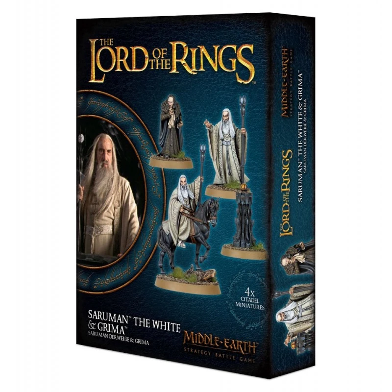 Le set contient 4 figurines plastique – Saruman à pied et monté, Gríma Wormtongue et un Palantír sur un socle. Figurines fournies avec un socle rond Citadel de 40mm et trois socles ronds Citadel de 25mm. Leurs règles se trouvent dans Armies of The Lord of The Rings™.