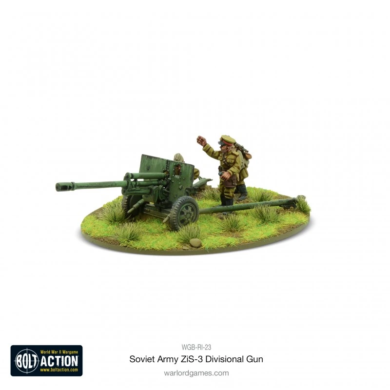 Classic Soviet artillery piece, the 76mm ZIS3 divisional gun, commander and two crew figures. This gun was made in the thousands and can be used in artillery support or anti-tank roles.