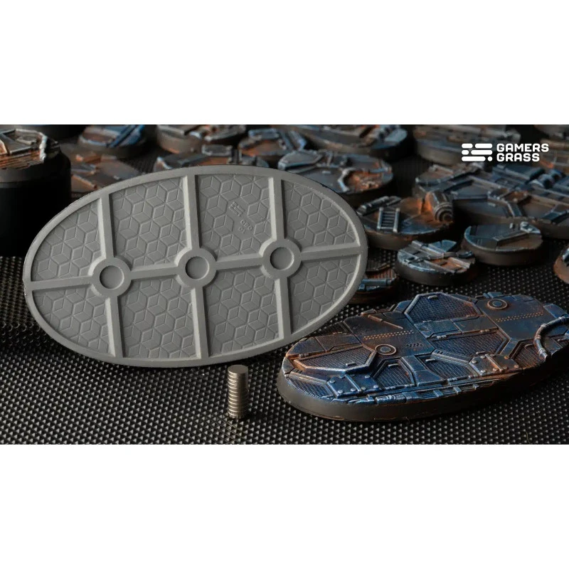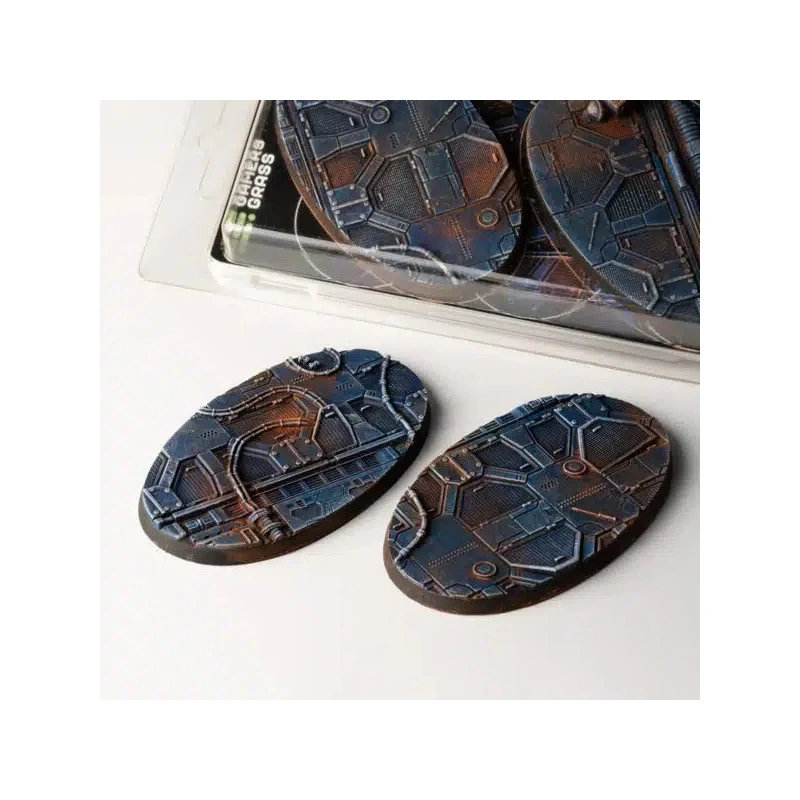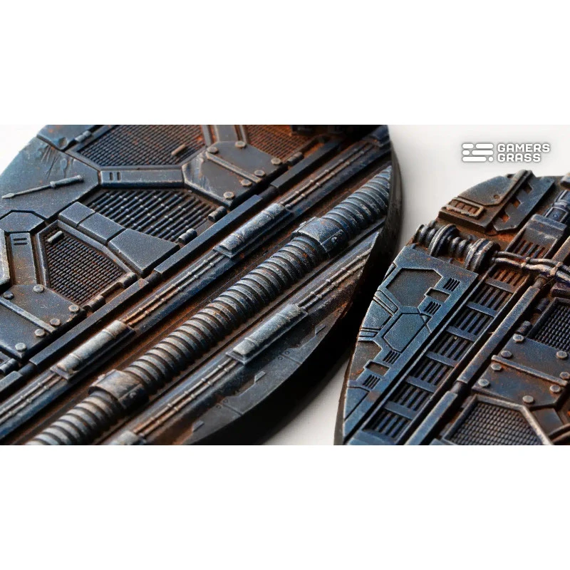 This blister contains 2 thermoplastic 90mm wide oval Battle Ready Bases, in a Spaceship Corridor theme.