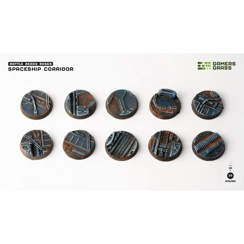 This blister contains 10 thermoplastic 25mm wide round Battle Ready Bases, in a Spaceship Corridor theme.