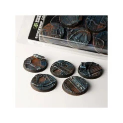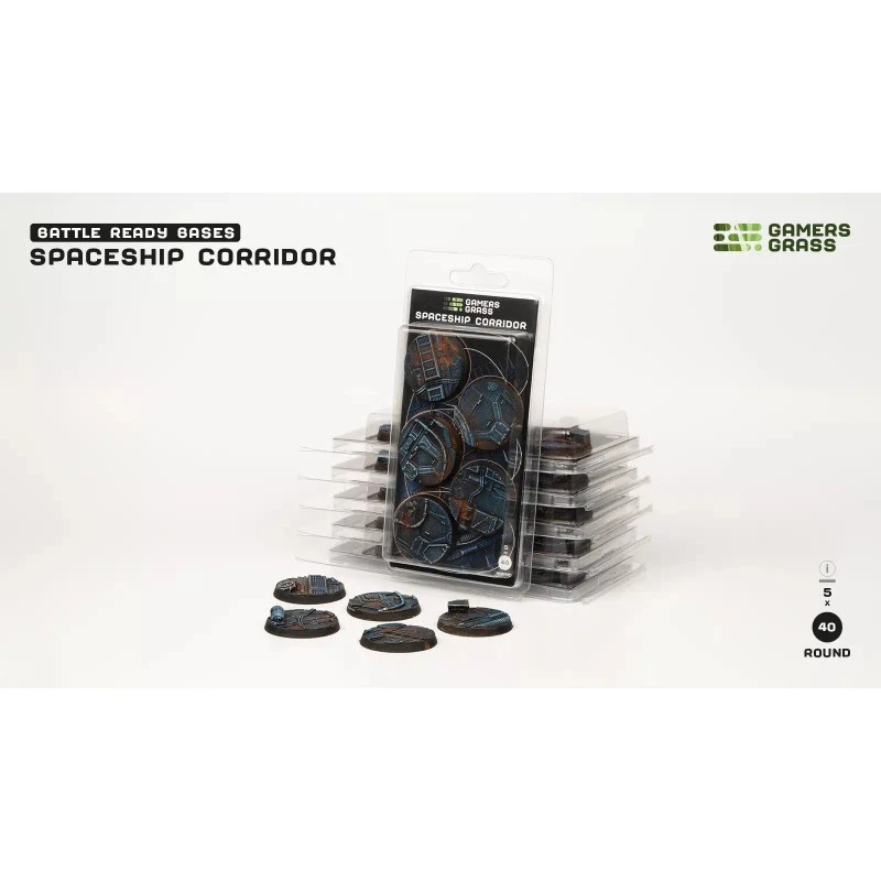 This blister contains 5 thermoplastic 40mm wide round Battle Ready Bases, in a Spaceship Corridor theme.