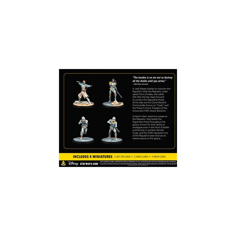 Un Général Jedi Iconique et ses alliés entrent dans les duels de Star Wars : Shatterpoint dans ce set ! Obi-Wan Kenobi, l’un des héros les plus emblématiques de la République, se bat pour contenir la menace Séparatiste quel qu’en soit le prix. Ce set l’ajoute à Star Wars Shatterpoint, ainsi que le Commandant Clone Cody et deux soldats Clones de la phase II du célèbre 212eme bataillon d’attaque. Qu’elles soient utilisées ensemble en tant qu’escouade complète ou combinées avec d’autres personnages, les figurines magnifiquement sculptées de ce pack sont accompagnées de toutes les cartes dont les joueurs ont besoin pour libérer leurs capacités uniques sur le champ de bataille.