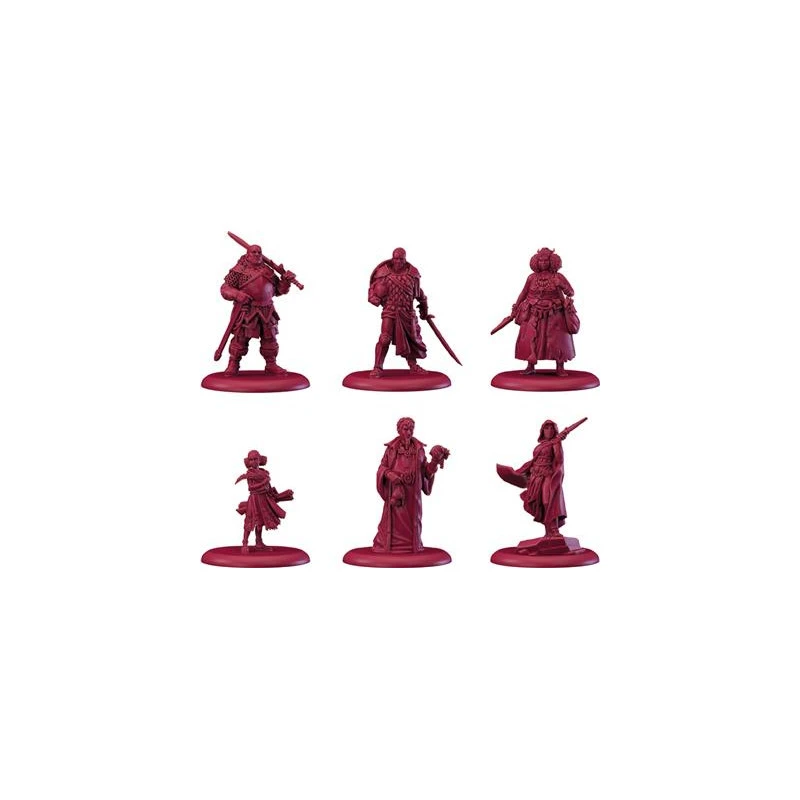 Cette boîte contient 25 cartes (5 Attachements, 4 Unités Non Combattantes, 16 Tactiques) et 6 figurines de Héros Targaryens : Marselen, Mirri Maz Duur, Quaithe, Hizdahr Zo Loraq, Missandrei et Skahaz Mo Kandaq.