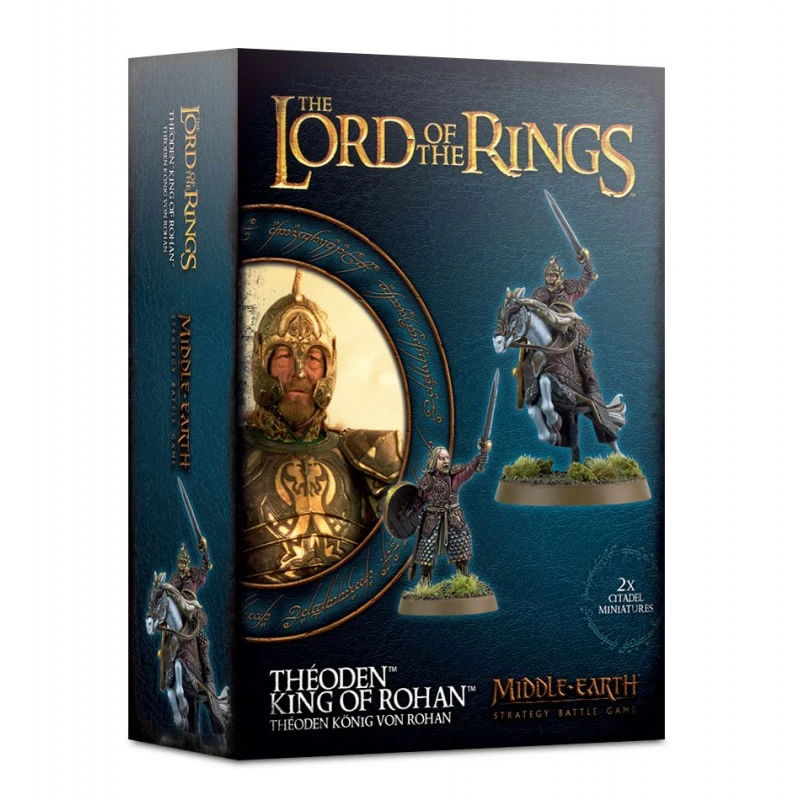 Théoden, King of Rohan à pied et monté est un kit plastique composé de 2 figurines, 1 à pied et 1 montée représentée en pleine charge. Les deux figurines proposent en option une tête nue ou casquée, et toutes deux sont dotées d’une armure lourde ainsi que de l’épée Herugrim. À pied, Théoden tient un bouclier; À cheval, ledit bouclier est rangé.