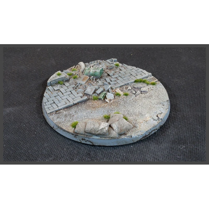 This pack contains 1 round Battle Ready Base 100mm wide in an urban warfare theme.