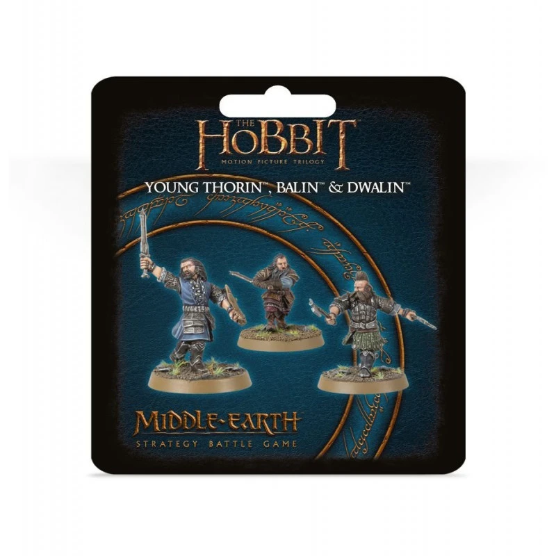 Contient trois figurines en résine – Thorin, Dwalin et Balin dans leur jeunesse – fournies avec trois socles ronds Citadel de 25mm. Les règles associées se trouvent dans Armies of The Hobbit™.